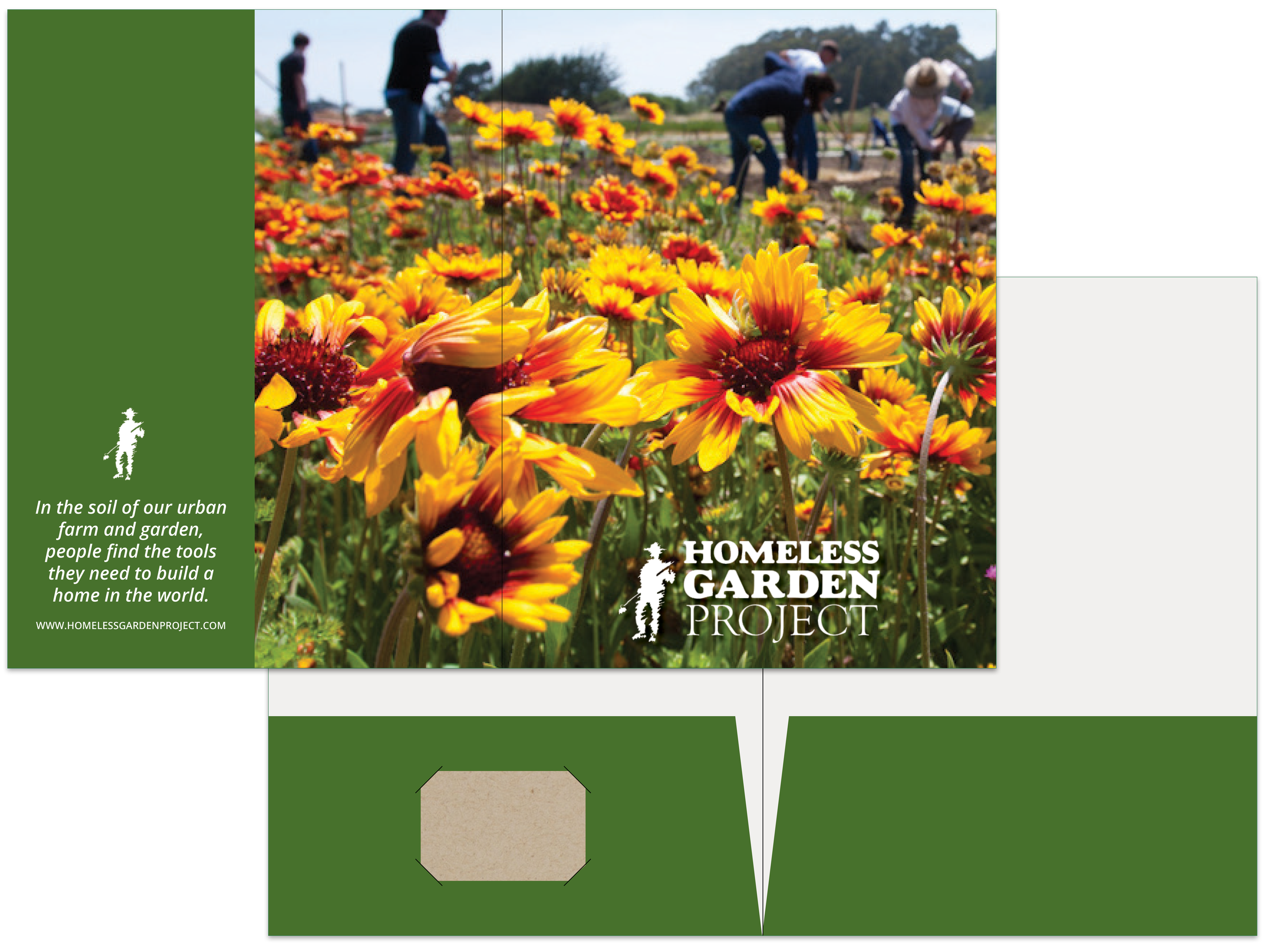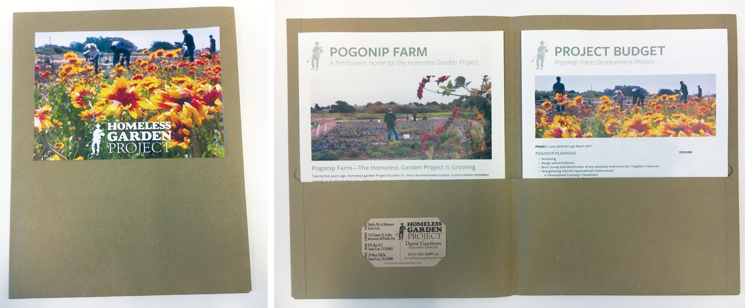 Pogonip Farm Site Fundraising Campaign—Branded folder design, recycled folder design, and supporting collateral design for Homeless Garden Project’s Pogonip farm site fundraising campaign. Folders were intentionally designed for evergreen usage, not specific to the initial use fundraising campaign, and collateral was designed to be easily editable by Homeless Garden Project Staff using MS Word.
