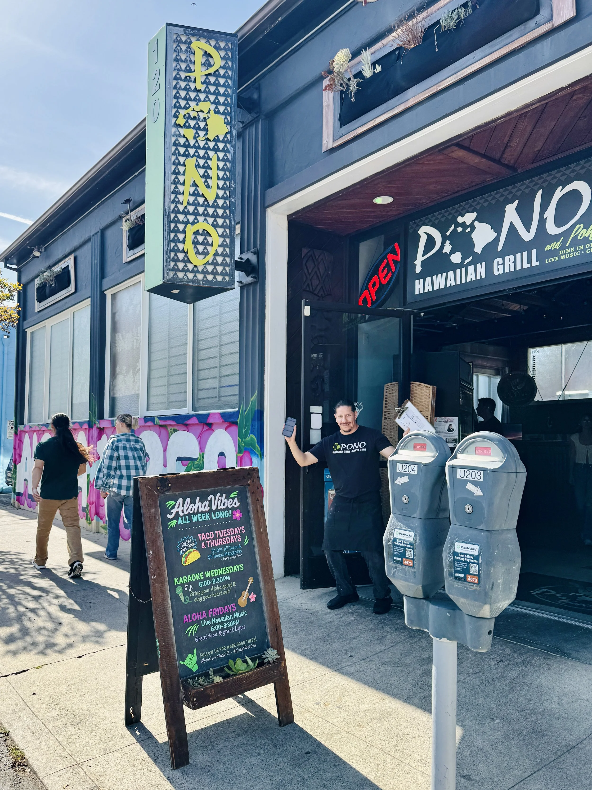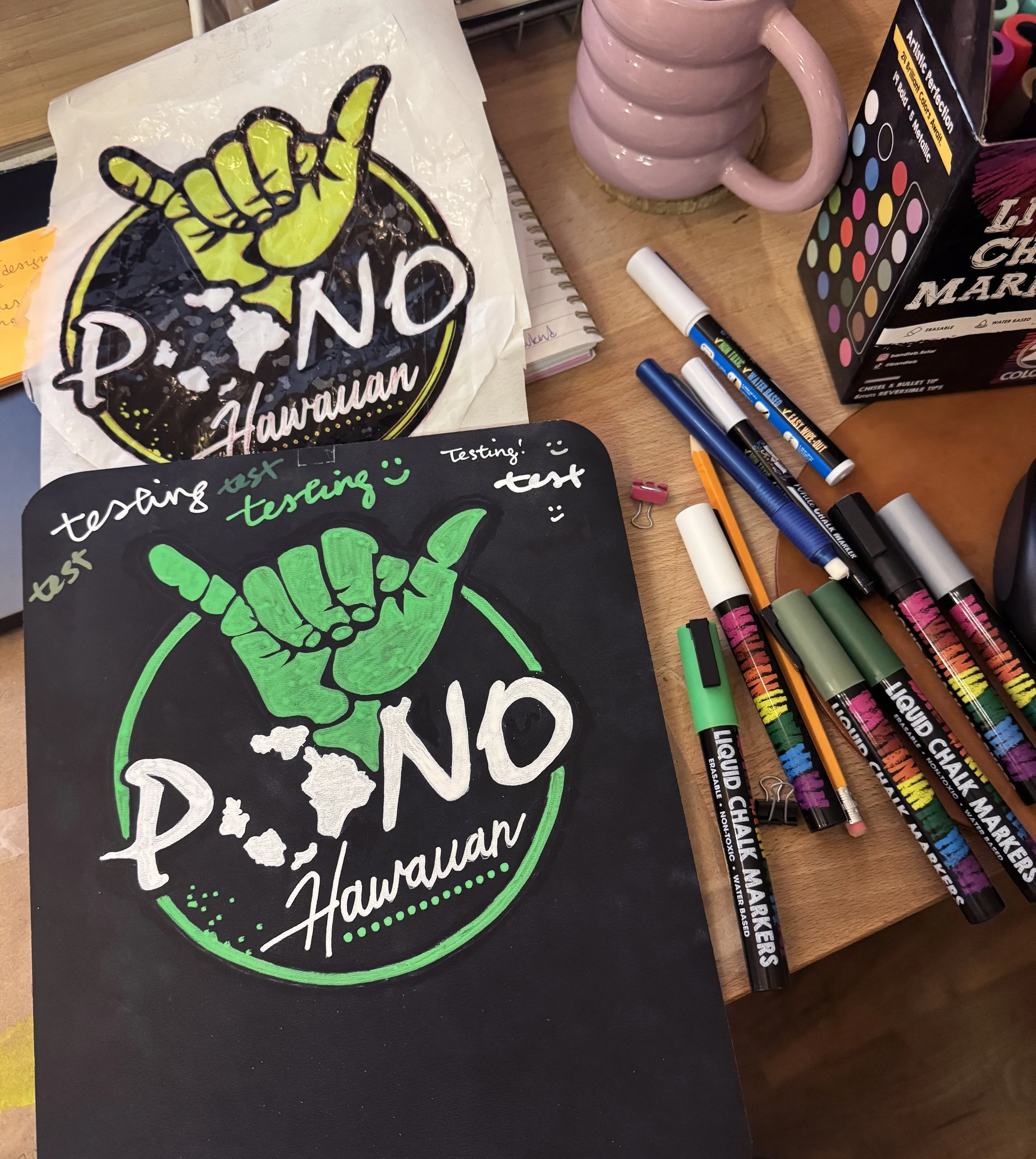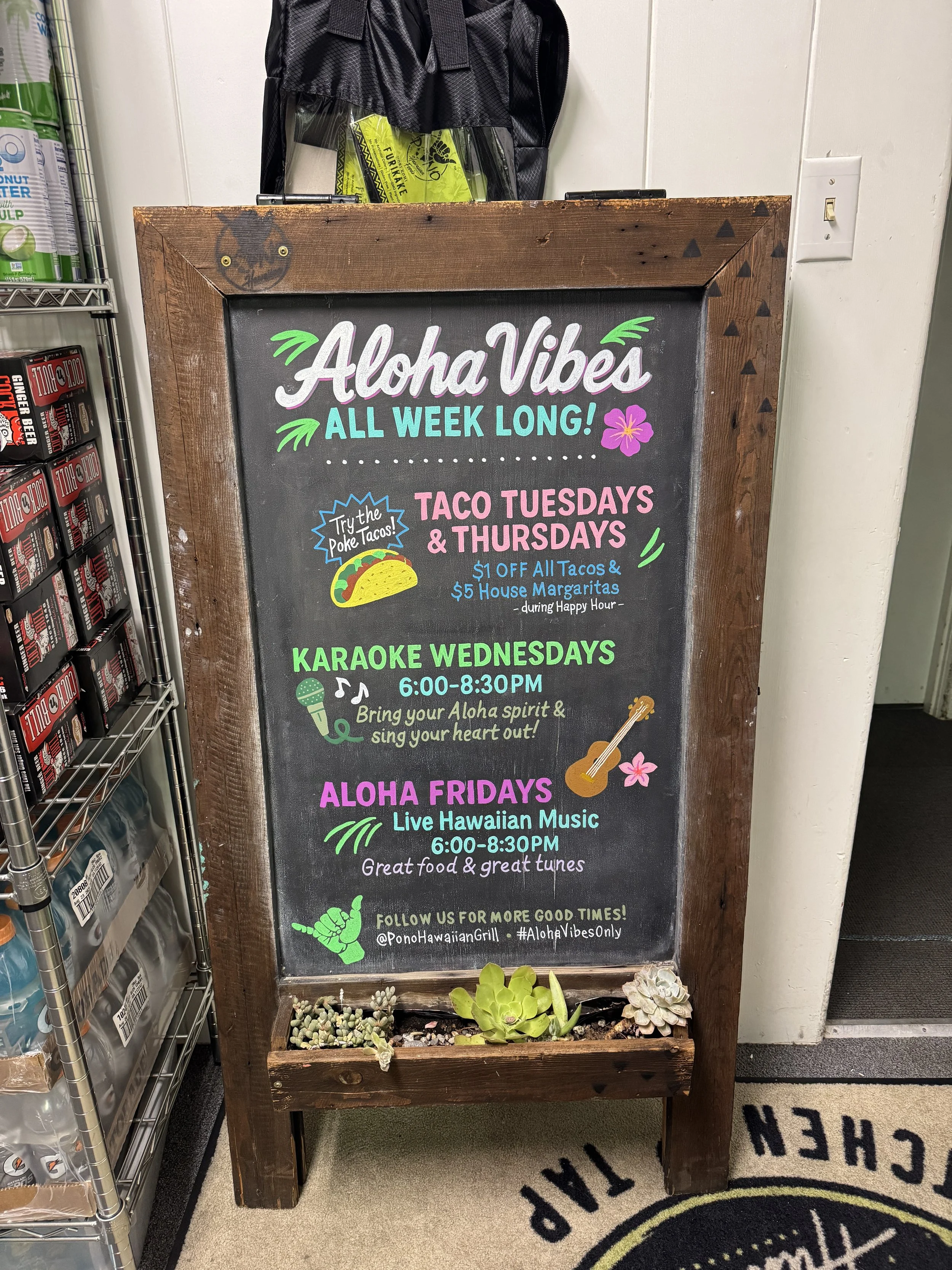 Bar menu, in-restaurant TV advertisements, inserts for napkin holders, takeout menus, chalkboard art, and more for Pono Hawaiian Grill.
